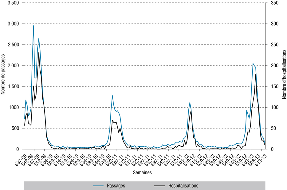 Figure 4 : Nombres hebdomadaires de passages aux urgences et d’hospitalisations pour grippe. Réseau Oscour®, semaines 37/2009-14/2013, France métropolitaine