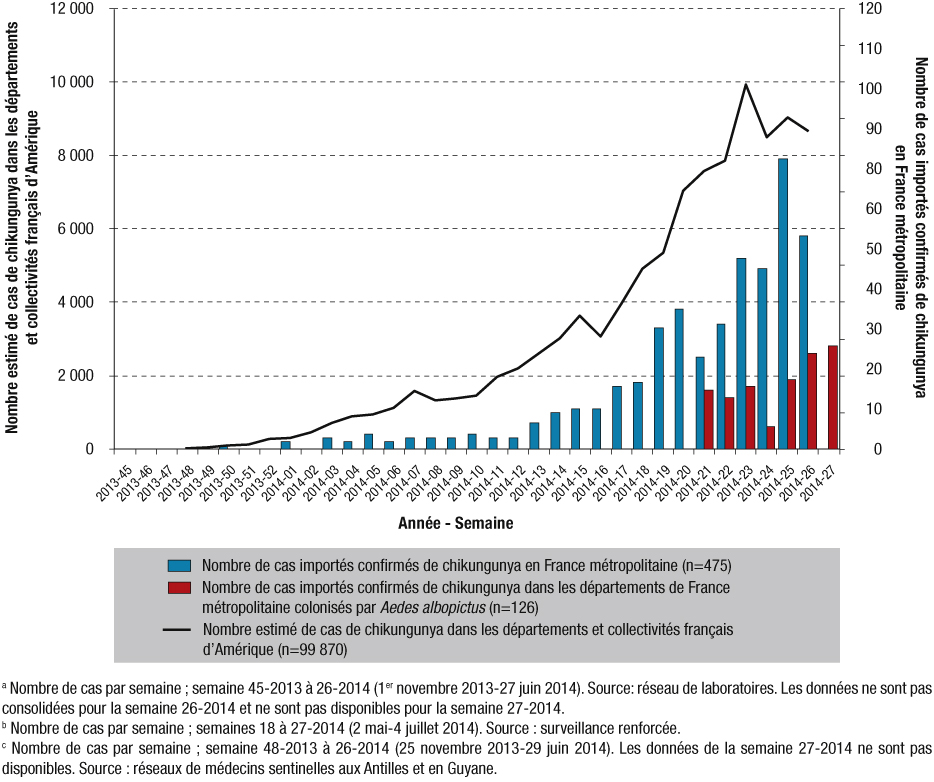 Figure 2 : Nombre de cas importés confirmés en France métropolitainea, nombre de cas importés confirmés dans les départements de France métropolitaine colonisés par Aedes albopictus pendant la période d’activité du moustiqueb et nombre estimé de cas cliniquement évocateurs de chikungunya dans les départements et collectivités français d’Amériquec