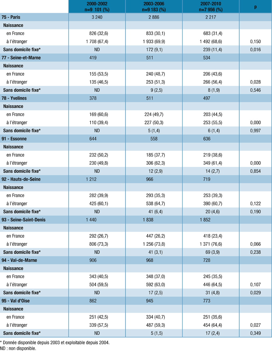 Tableau 2 : Caractéristiques des cas de tuberculose maladie sur trois périodes d’étude et par département, Île-de-France, 2000-2010