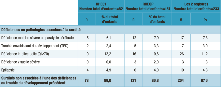Tableau 4 : Description des déficiences ou troubles du développement associés à la surdité (certains enfants pouvant présenter une association de plusieurs déficiences ou pathologies), France