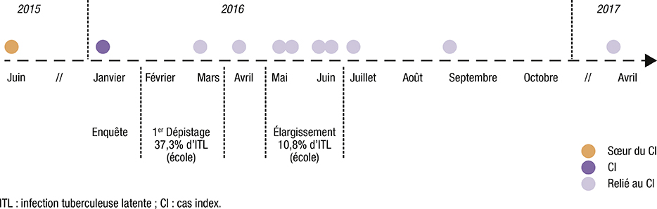 Figure 2 : Frise chronologique de survenue des cas dans le cadre d’une micro-épidémie de tuberculose survenue dans une école