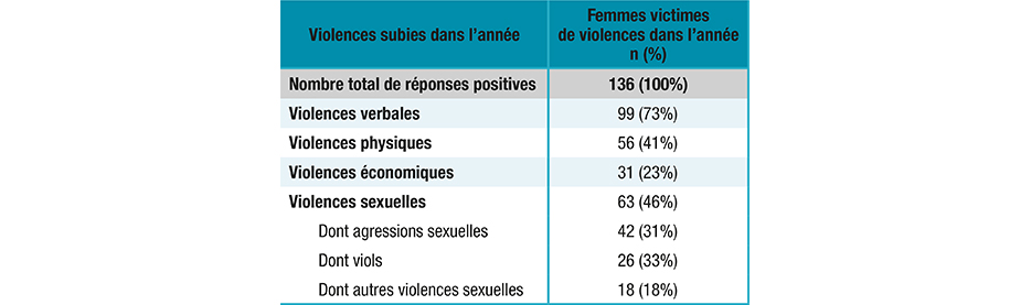 Tableau 3 : Prévalence des différents types de violence, parmi les femmes ayant subi des violences