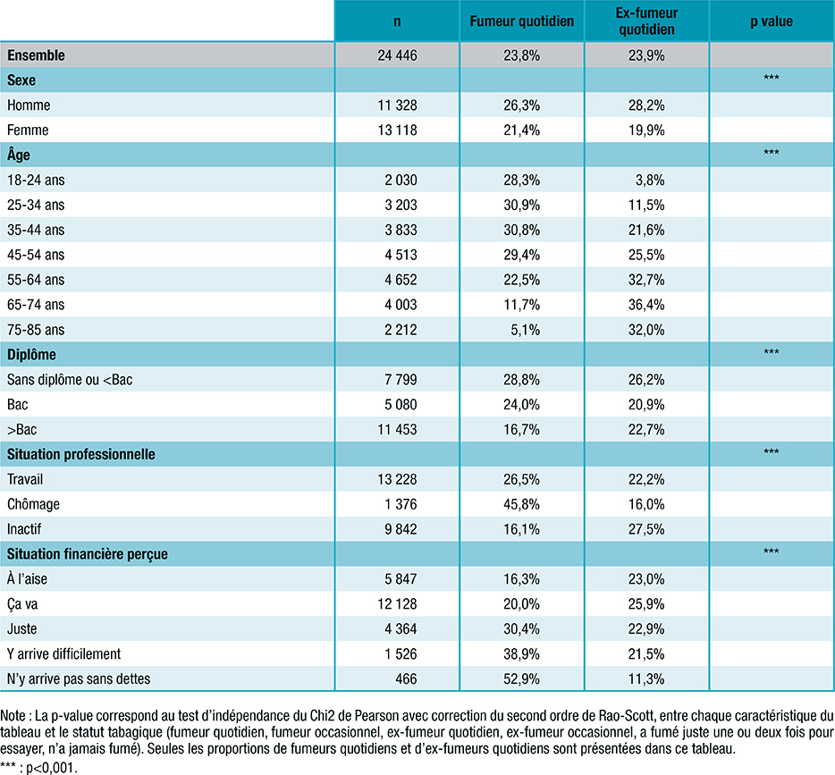 Tableau 1 : Proportion de fumeurs quotidiens et d’ex-fumeurs quotidiens parmi les 18-85 ans, en fonction des caractéristiques