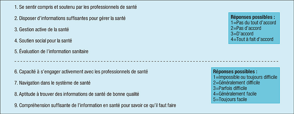 Les femmes enceintes ont été interrogées via le Health Literacy Questionnaire (HLQ), auto-questionnaire mesurant le niveau de littératie en santé, à partir des perceptions des personnes interrogées et de leurs capacités à évoluer au sein de leur environnement. C’est un questionnaire multidimensionnel, aux propriétés psychométriques validées 10. Il est considéré comme un Proms générique (Patient-reported outcomes measures). Son accès est soumis à licence. Il se compose de 44 questions courtes avec un vocabulaire simple, réparties en neuf échelles indépendantes. Les réponses sont au format d’une échelle de Likert à quatre ou cinq propositions permettant un système de notation sémantique (score de 1 à 4 ou 5) (encadré 1). Un score par échelle est ainsi calculé permettant d’identifier les forces et faiblesses en littératie en santé. Afin de décrire la population des femmes, 12 questions sociodémographiques ont été ajoutées.