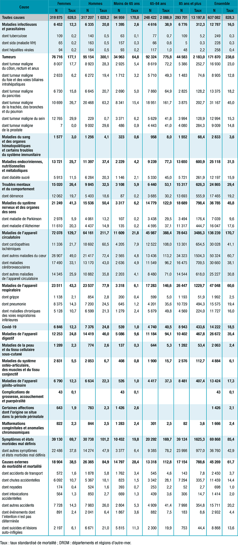 Tableau 1 : Nombre et taux standardisés de mortalité pour 100 000 habitants par cause de décès en 2023, par classe d’âge et