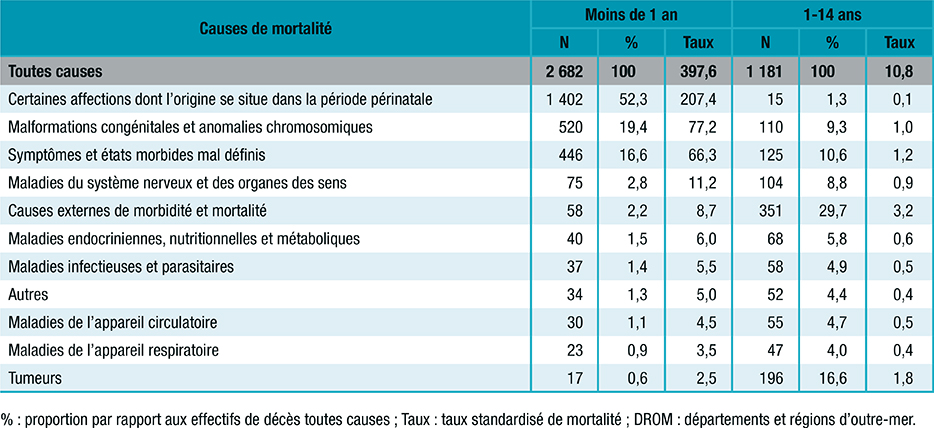 par cause de décès en 2023, chez les enfants de moins de 1 an et ceux âgés de 1-14 ans en France métropolitaine et DROM