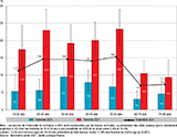 Agrandir l'imageLa prévalence des états anxieux (score strictement supérieur à 10 sur la sous-échelle HAD-A) était estimée à 12,5% [11,4-13,7]. Elle était nettement plus élevée chez les femmes (18,2%) que chez les hommes (6,4% ; p<0,001) et ce, quelle que soit la tranche d’âge. Les adultes de 25-64 ans apparaissaient les plus concernés (environ 15%), tandis que la prévalence diminuait à partir de 65 ans (environ 7%). Les états anxieux ont été observés chez 11,3% des 18-24 ans (5,3% chez les hommes vs 17,4% chez les femmes ; p<0,001) (figure 1).