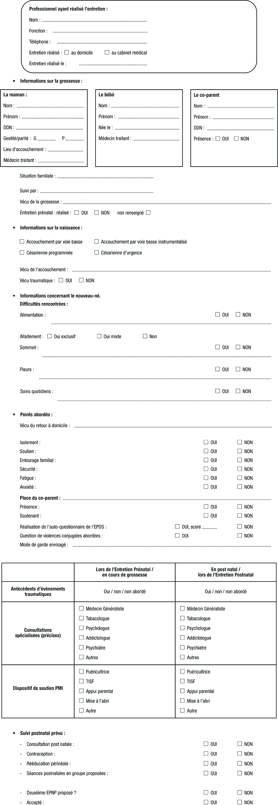 Les 24 sages-femmes de PMI ont été formées à la réalisation de l’EPNP sur l’année 2023, tout en débutant sa pratique. Elles ont dans le même temps travaillé à la confection d’une trame commune d’EPNP. Cette trame a été finalisée pour aboutir à un outil permettant de disposer de l’ensemble des éléments pertinents à la pratique de l’EPNP. Cette trame est disponible en annexe. Seules les données utiles à l’étude, issues de cette trame, ont été utilisées après avoir été anonymisées.
