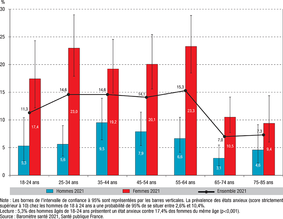 Figure 1 : Prévalence des états anxieux chez les 18-85 ans, selon le sexe et la classe d’âge, en 2021, France hexagonale