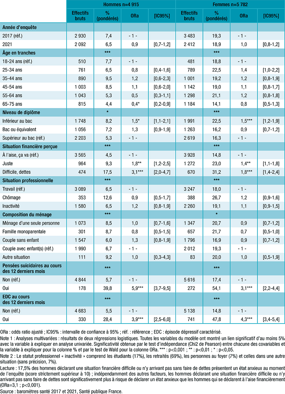 Tableau 2 : Facteurs associés aux états anxieux chez les 18-75 ans, selon le sexe, en 2017-2021, France hexagonale