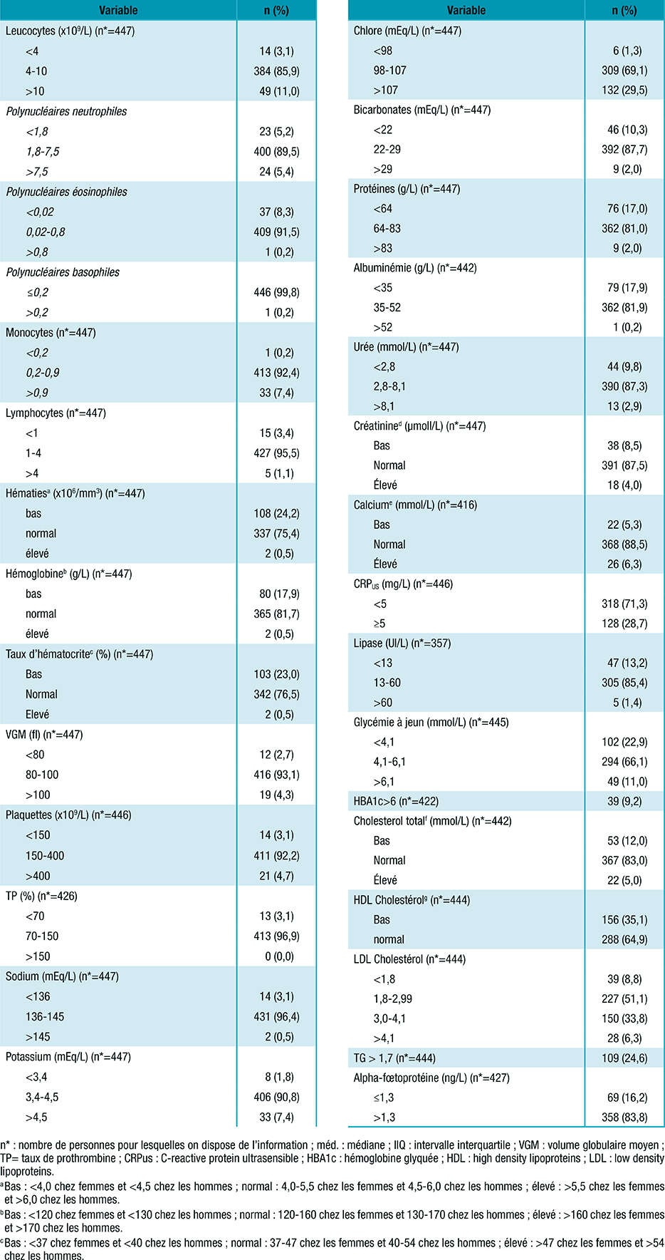 Tableau 3 : Données biologiques complémentaires des patients inclus dans l’étude Liverspin (N=450), 2 avril 2022-31 décembre 2023