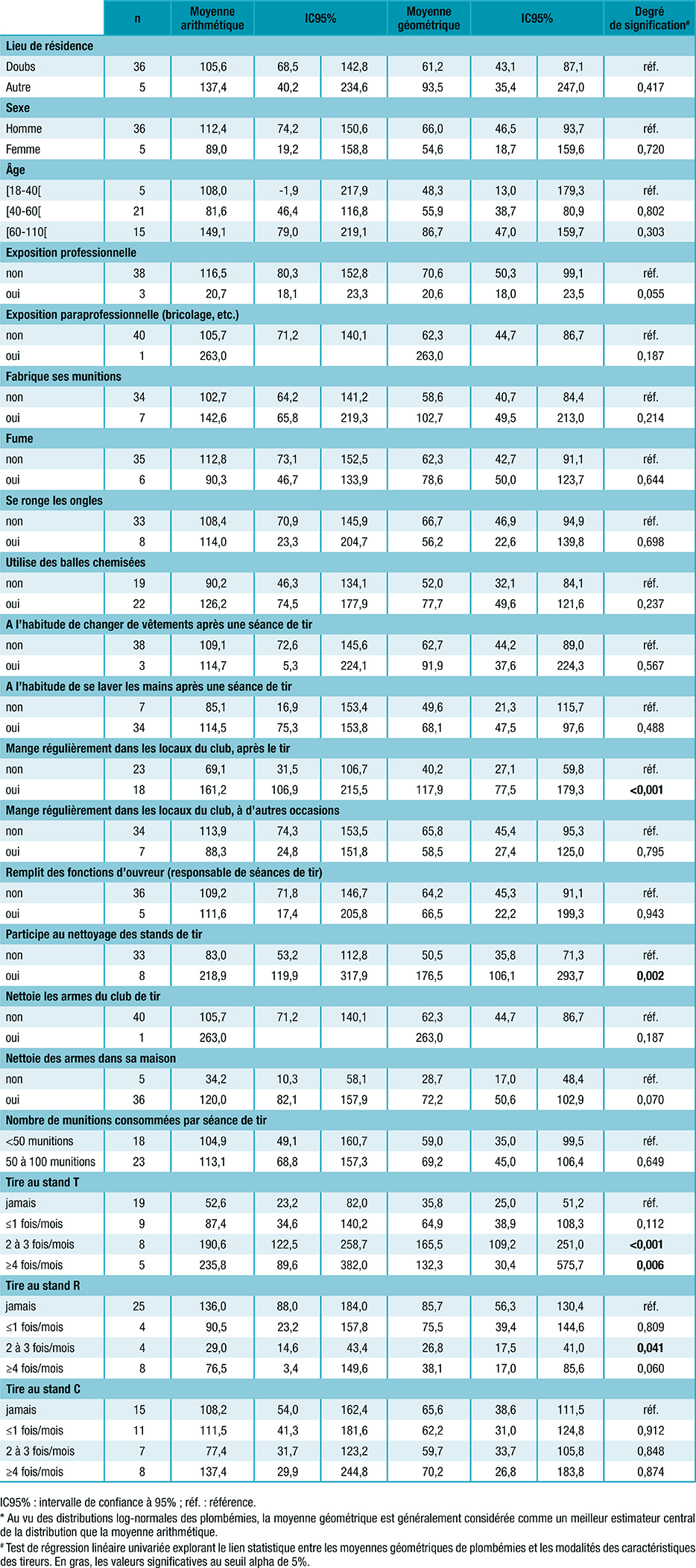 Tableau 1 : Moyennes arithmétique et géométrique* des plombémies en fonction des caractéristiques
