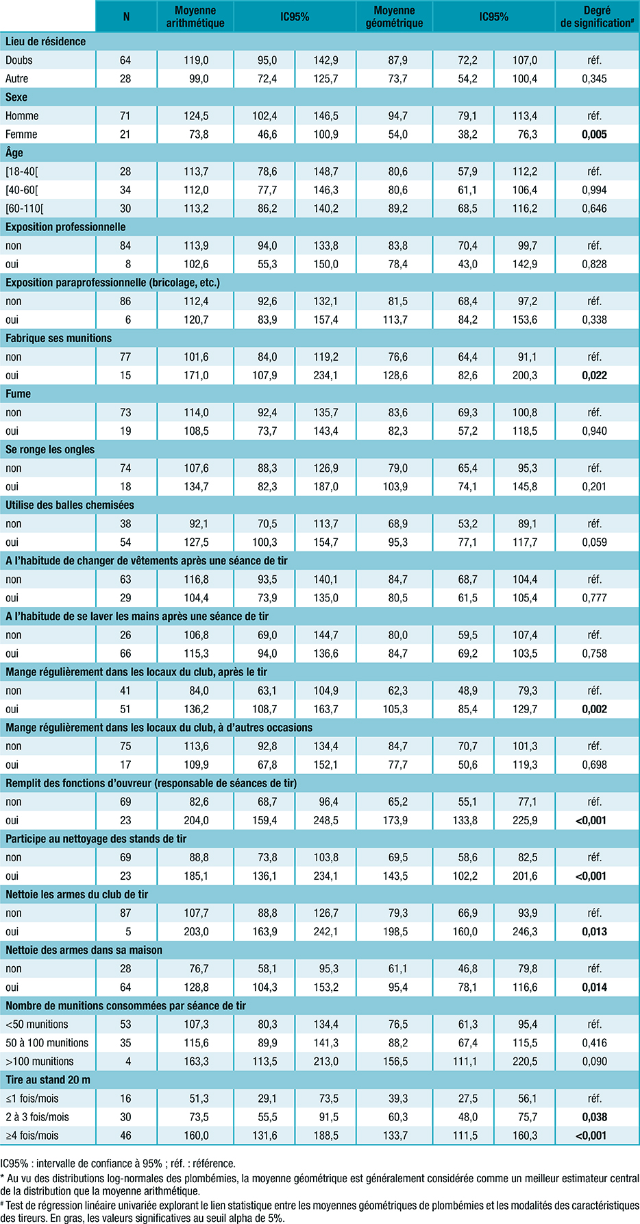 Tableau 2 : Moyennes arithmétique et géométrique* des plombémies en fonction des caractéristiques
