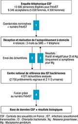 Proposé aux personnes de 18-59 ans ayant déjà eu un rapport sexuel dans leur vie, PrévIST invitait les répondants à CSF à réaliser à domicile un prélèvement, vaginal pour les femmes et urinaire pour les hommes. Les analyses biologiques ont été réalisées au Centre national de référence des IST bactériennes et les résultats redressés pour être représentatifs de la population générale.