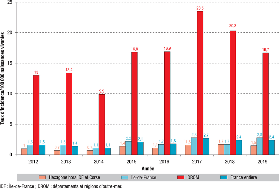 Figure 2 : Taux d’incidence de la syphilis congénitale chez les enfants de moins de 2 ans identifiés dans le PMSI/100 000 naissances vivantes en France, entre 2012 et 2019
