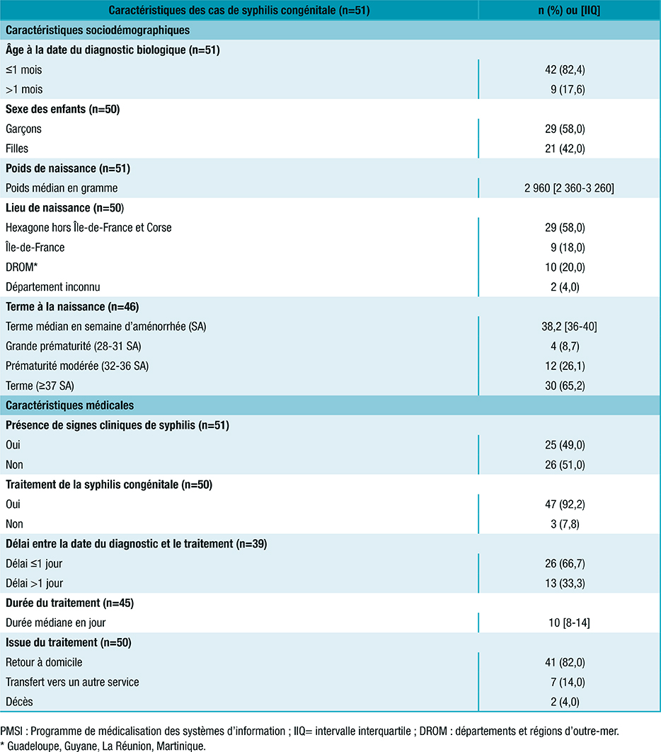 Tableau 2 : Caractéristiques sociodémographiques et médicales des 51 cas de syphilis congénitale, France, PMSI 2012-2019
