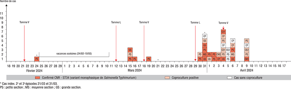 Dans l’article : Cas groupés de Salmonella Typhimurium au sein de trois écoles élémentaires et maternelles en région Pays de la Loire, France, mars-avril 2024