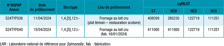 Tableau 2 : Résultats de l’analyse génomique des souches reçues au LNR Salmonella spp. et résultats cgMLST du variant monophasique de Salmonella Typhimurium dans trois écoles maternelles et élémentaires, Loire-Atlantique, mars-avril 2024