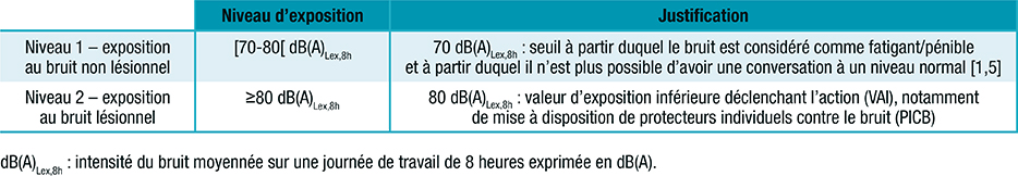 Tableau 1 : Niveaux d’exposition utilisés dans la matrice emplois-expositions bruit