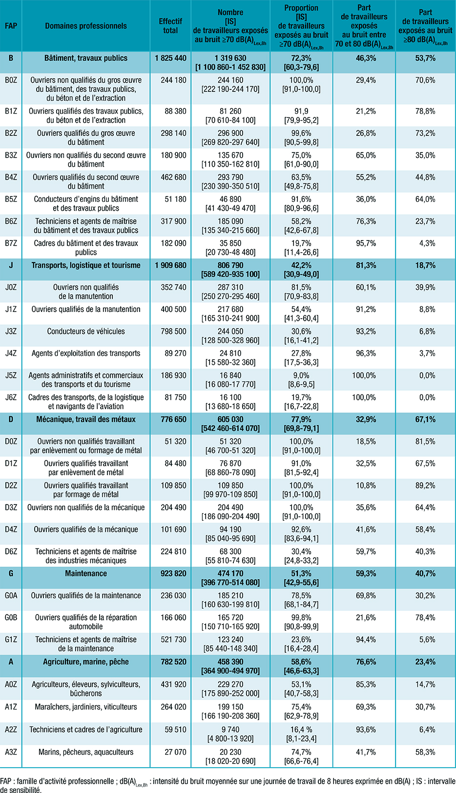 Tableau 5 : Nombre et proportion de travailleurs exposés au bruit ≥70 dB(A)Lex,8h et part de travailleurs par niveau d’exposition, par FAP avec plus de 400 000 travailleurs exposés chacune, France, 2019