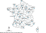 La zone d’étude correspond aux 33 départements pour lesquels Météo-France a produit les indicateurs d’exposition pour une station représentative d’un département (figure 1 ; liste des départements : 05, 06, 10, 12, 13, 14, 17, 2A, 21, 24, 29, 31, 33, 34, 35, 36, 37, 40, 44, 50, 51, 55, 60, 61, 62, 63, 64, 66, 67, 69, 86, 87, 94). Dans ces 33 départements, les données des services d’urgences du réseau Oscour® ont été agrégées. La période d’étude s’étend du 1er juin au 15 septembre (période d’activation du Sacs) des années 2015 à 2019. Avant 2015, le nombre d’hôpitaux transmettant à Oscour® et le nombre de vagues de chaleur étaient moins importants. Les années à partir de 2020 ont été exclues, étant donné que la pandémie de Covid-19 a modifié les recours aux soins d’urgence.