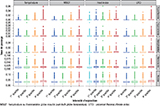 Le tableau 2 détaille les RR de passages aux urgences par causes, pour une augmentation interquartile de chaque indicateur. Par exemple, lorsque la Tm augmente d’un IQR (5,7°C), le RR de passages aux urgences pour hyperthermie est de 3,97 (intervalle de confiance à 95%, IC95%: [3,82-4,13]). Pour le WBGT, ce RR est de 3,81 [3,67-3,95]. Les RR les plus élevés sont observés pour l’hyperthermie puis
