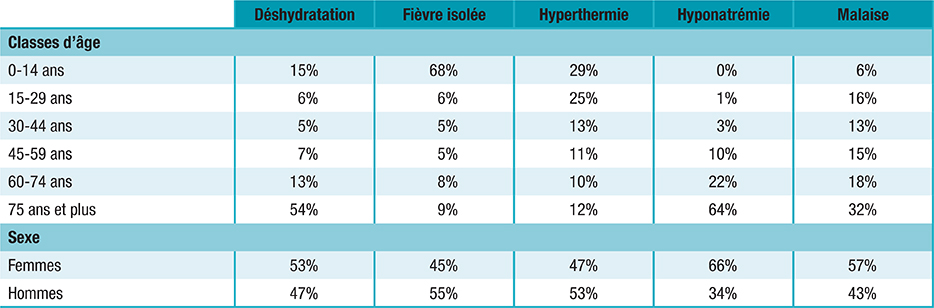 Tableau 1 : Répartition des passages aux urgences pour chaque regroupement syndromique étudié, selon la classe d’âge ou le sexe, 2015-2019