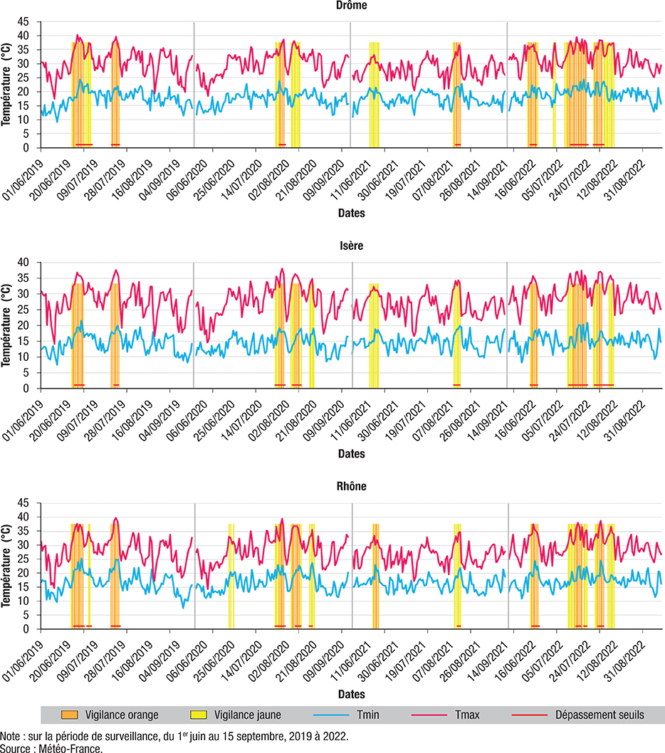 Figure 1 : Températures minimales et maximales, périodes de dépassements de seuil canicule et de vigilance jaune et orange,