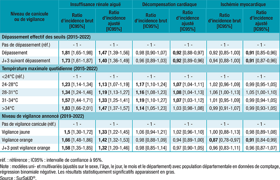 Tableau 2 : Modélisation du sur-risque de passages aux urgences pour insuffisance rénale aiguë, décompensation cardiaque et ischémie