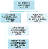 Enfin, seul le premier examen audiométrique de chaque individu a été pris en compte. Au final, l’analyse a porté sur 8 270 salariés (figure 1).