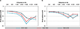 L’âge moyen des personnes présentant une perte auditive supérieure ou égale à 20 dB était de 43,1 ans [42,7-43,4] chez les hommes et de 43,2 ans [42,1-44,3] chez les femmes. L’âge moyen des personnes présentant une perte auditive invalidante était de 45 ans [44,3-45,7] chez les hommes et de 45,6 ans [41,8-49,4] chez les femmes (données non présentées). La figure 3 présente les audiogrammes moyens pour les trois périodes chez les hommes et chez les femmes. Quel que soit le sexe, on observe une encoche à 4 000 Hz, correspondant au premier stade de la surdité, qui est plus importante sur la période de 1970 à 1980 et qui diminue sur les décennies suivantes. La figure 4 présente les audiogrammes moyens par classe d’âge et par période chez les hommes. La perte auditive s’accentue selon les classes d’âge pour toutes les fréquences et notamment à 4 000 Hz.