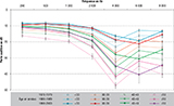 Les mesures audiométriques de l’ensemble des travailleurs de l’étude ont été moyennées pour chacune des fréquences, de façon à disposer d’un audiogramme moyen par période. Ces audiogrammes moyens ont été réalisés par sexe et par classe d’âge pour les hommes.
