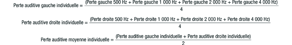 La perte auditive moyenne de la population a été estimée en moyennant la perte auditive due au bruit pour chacun des sujets à partir des résultats audiométriques mesurés sur les deux oreilles à 500 Hz, 1 000 Hz, 2 000 Hz et 4 000 Hz.