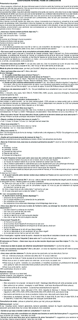 Les consultations, programmées toutes les 30 minutes, étaient conduites par un médecin ou une sage-femme. La pression artérielle était mesurée, un examen clinique était pratiqué sur point d’appel (éruption cutanée, douleurs ou plainte fonctionnelle). L’historique de violences était systématiquement recherché et la santé mentale était explorée si le participant l’abordait. Un questionnaire de recherche était enchâssé dans la trame de consultation. Un bilan biologique tenant compte des antécédents, d’éventuels résultats antérieurs et des expositions était prélevé sur place à la fin de la consultation. Il comprenait un dépistage du VIH chaque fois que le statut VIH n’était pas documenté pendant la grossesse en cours ou juste avant. Tous les immigrés (participants nés étrangers à l’étranger) qui n’avaient jamais fait de dépistage de la syphilis, des hépatites virales B et C étaient testés, tandis que ce dépistage était ciblé pour les futurs pères nés en France. La sérologie bilharziose était prélevée si le participant avait vécu en zone d’endémie et n’avait jamais été dépisté. Un échantillon d’urines était collecté pour amplification du génome de Chlamydia trachomatis et Neisseria gonorrhoeae lorsque le participant avait moins de 30 ans ou déclarait plusieurs partenaires dans l’année. Le déroulé de la consultation, le questionnaire de recherche et le contenu du bilan biologique sont détaillés en annexes 1, 2 et 3.