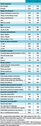 Près des deux tiers des participants étaient immigrés (63%, N=842). Parmi eux, 63% étaient en France depuis 7 ans ou plus ; 47% étaient nés en Afrique subsaharienne, 29% en Afrique du Nord ou au Moyen-Orient et 11% en Asie. Un cinquième des participants immigrés était en situation irrégulière et 13% n’avaient aucune couverture maladie (tableau 1).