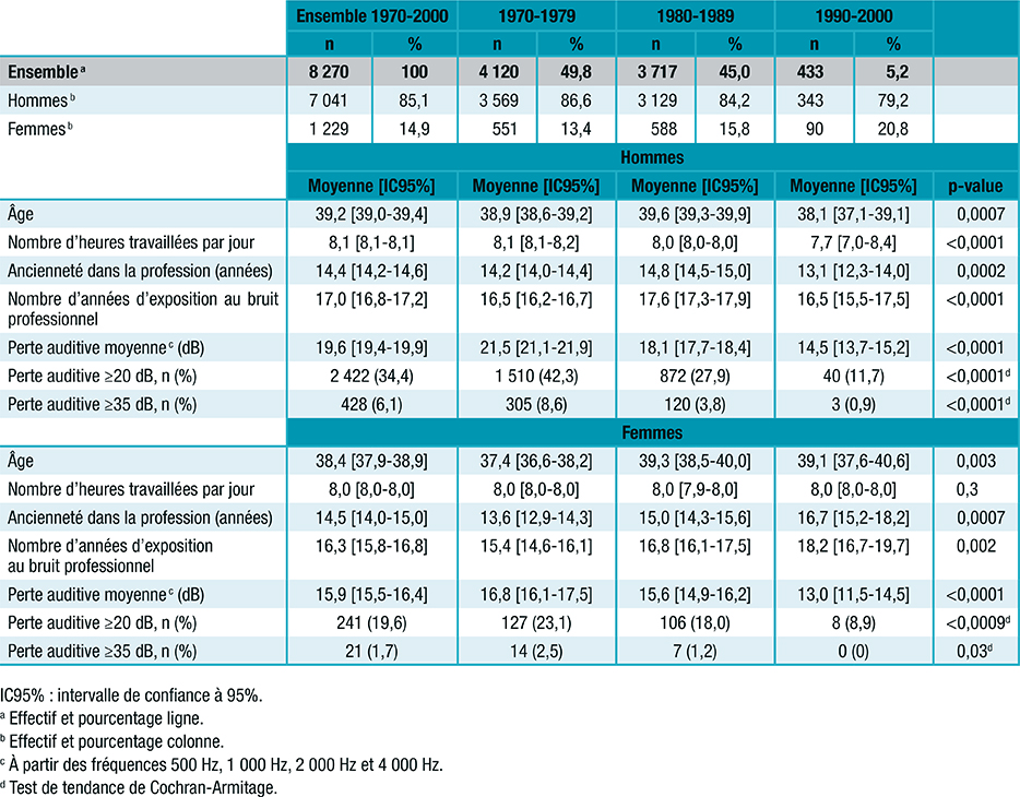 Tableau 1 : Description de la population étudiée et de la perte auditive due au bruit professionnel, Rhône-Alpes, 1970-2000