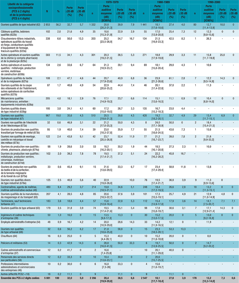 Tableau 3 : Évolution de la perte auditive due au bruit chez les travailleurs masculins en fonction des catégories socioprofessionnelles