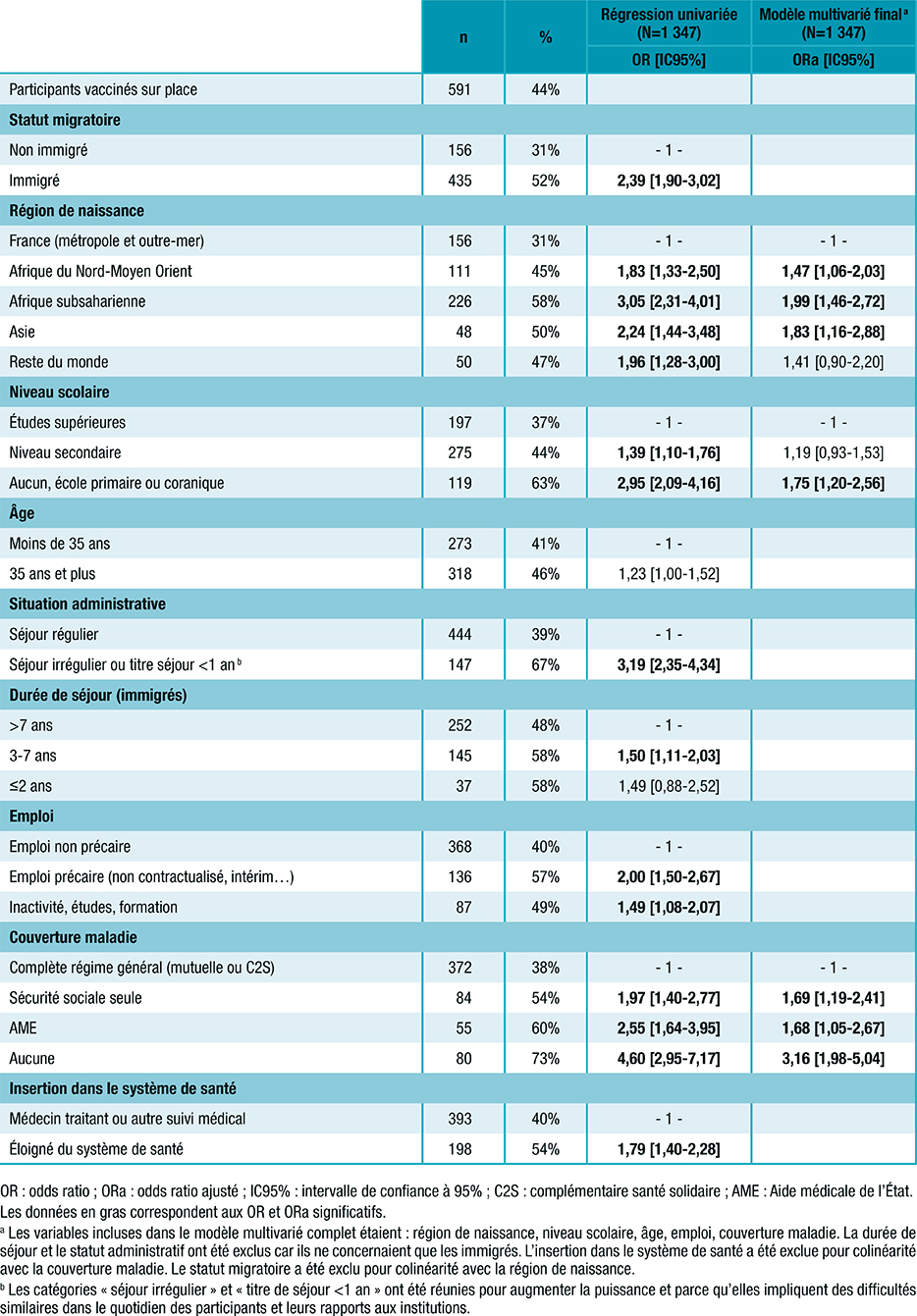 Tableau 4 : Facteurs associés à l’injection d’au moins une valence du calendrier vaccinal en consultation prénatale paternelle, Montreuil, 2021-2022