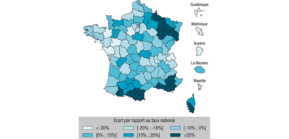 Figure 1 : Taux départemental des patients hospitalisés pour cardiopathie ischémique standardisé sur l’âge, France, 2022