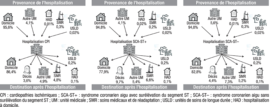 Figure 4 : Provenances et issues des hospitalisations pour cardiopathie ischémique, France, 2022