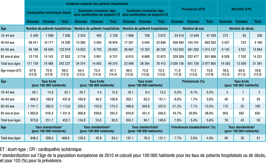 Tableau 1 : Incidence annuelle de patients hospitalisés, prévalence et mortalité par cardiopathie ischémique, France, 2022