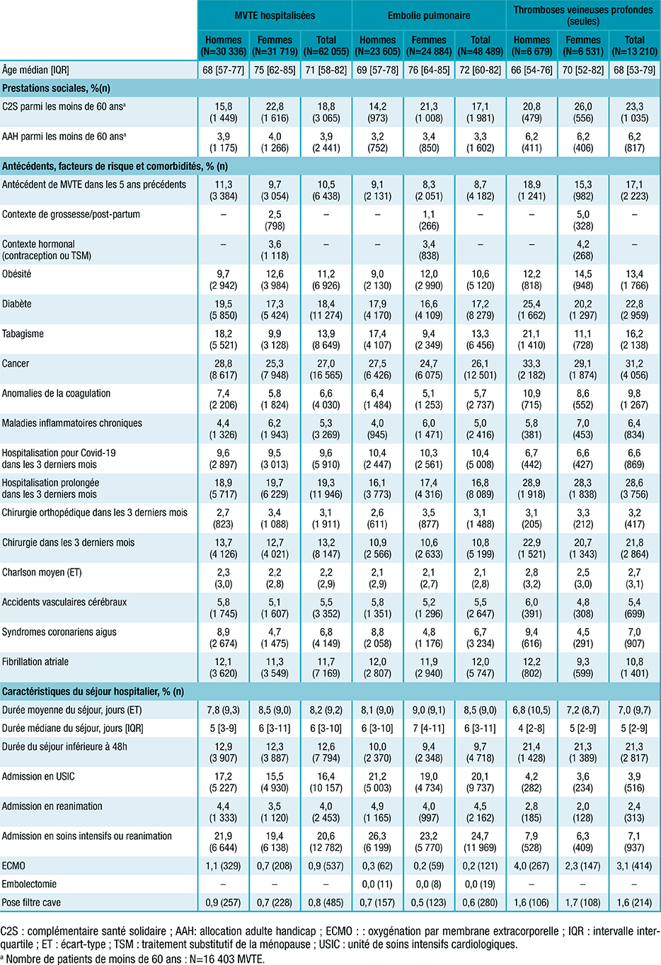 Tableau 2 : Caractéristiques des patients hospitalisés pour maladie veineuse thromboembolique (MVTE), France, 2022