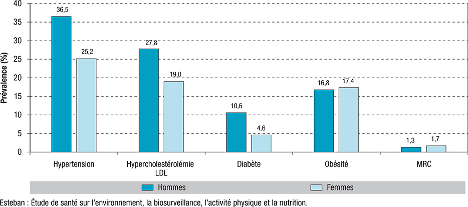Figure 1 : Prévalence des principaux facteurs de risque métaboliques chez les adultes de 18 à 74 ans, par sexe, France hexagonale, étude Esteban, 2015