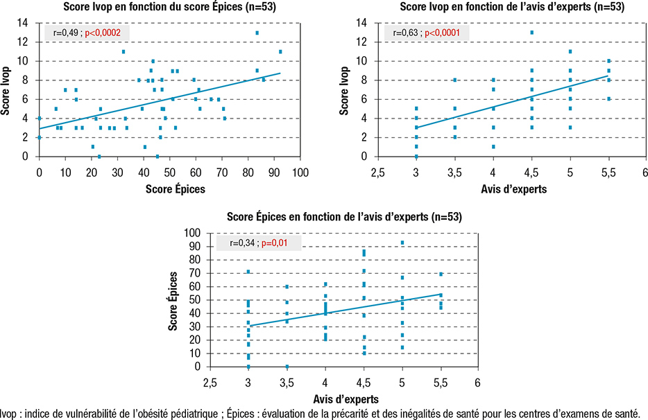 Figure 2 : Corrélations linéaires entre les scores Ivop, l’avis d’experts et le score Épices