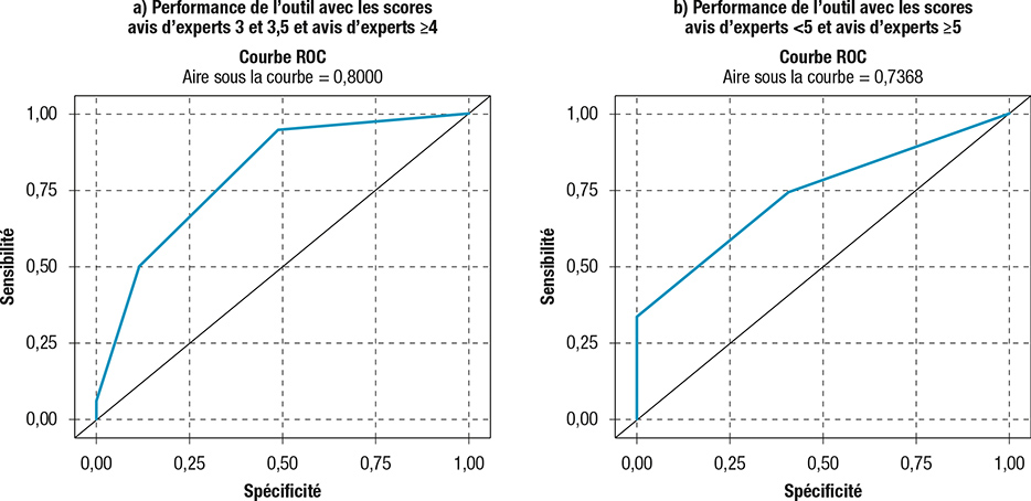 Figure 3 : Courbes ROC pour étude des performances de l’outil combinant « Ivop + excès de poids » en fonction des seuils du score avis d’experts