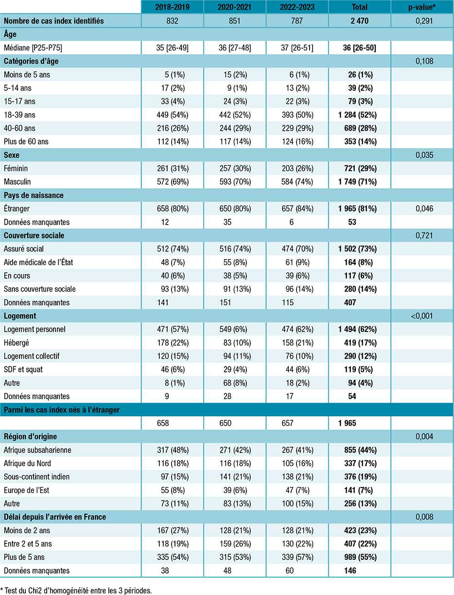Tableau 1 : Description des caractéristiques des cas index résidant en Seine-Saint-Denis entre 2018 et 2023