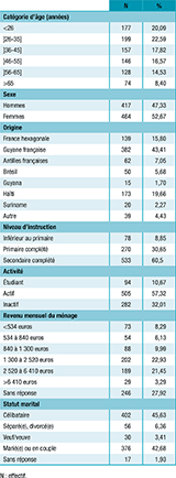 Sur les 881 personnes interrogées, le sexe ratio était de 0,9 ; 43% étaient originaires de Guyane, 20% d’Haïti, 16% de l’Hexagone, 14% avaient un revenu familial mensuel inférieur à 840 euros, moins de la moitié étaient en couple, 33% étaient inactifs (étudiants, retraités, parents au foyer), 60% avaient complété un niveau d’étude secondaire (tableau).