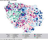 Agrandir l'imageLa carte met en évidence une forte hétérogénéité spatiale en termes de participation (figure 1) : certaines zones concentrent simultanément forte précarité (FDep élevée) et participation plus faible que la moyenne régionale (c’est l’exemple de plus des 3/4 du département de Seine-Saint-Denis et de l’est de la Seine-et-Marne), tandis que d’autres présentent l’inverse (FDep faible et participation supérieure). La cartographie (figure 2) associe le FDep20 à l’écart du taux régional de réalisation de la coloscopie (moyenne pondérée=75,9%). Les teintes chaudes signalent des taux supérieurs à la moyenne et les teintes froides des taux inférieurs ; la distribution spatiale révèle des poches de forte réalisation à l’est/sud-est et une grande hétérogénéité au sein des communes défavorisées, suggérant que la précarité territoriale n’explique pas à elle seule les variations observées. Avec un taux maximal 32,2% en 2021 (tableau 1), le Val-de-Marne se distingue par sa forte Tx_colo_mois et par la forte concentration de communes défavorisées ayant une forte Tx_colo_mois (figure 3).