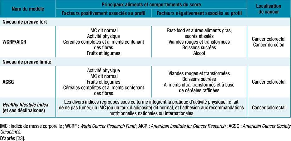 Tableau 1 : Scores et profils alimentaires/de mode de vie associés à une diminution du risque de cancer colorectal