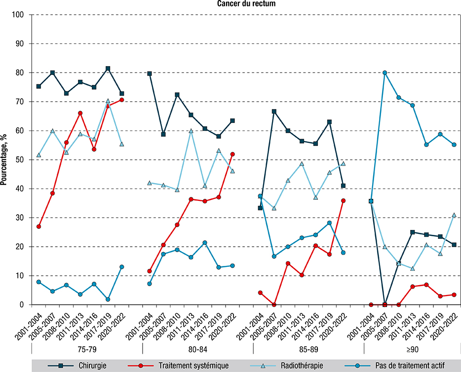 Figure 4 : Répartition des primo-traitements (chirurgie, traitement systémique, radiothérapie ou aucun traitement actif) pour le cancer du rectum par classes d’âge, Hérault, 2001-2022